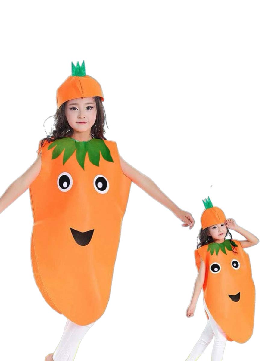 Bright, bold, and totally adorable — this Carrot Costume is all about fun! Featuring an oversized orange carrot body with a big happy face and leafy green trim around the neckline, it’s designed to turn heads and spark smiles. Topped with a matching carrot hat, it’s perfect for parties, plays, parades, or just veggie-themed silliness.