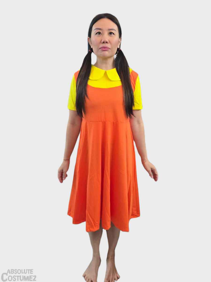 Squid Game Doll costume for adult. A spooky set from the popular Netflix Korean TV series. Perfect for Cosplays, Carnival, performance, Halloween and Christmas Party dress.